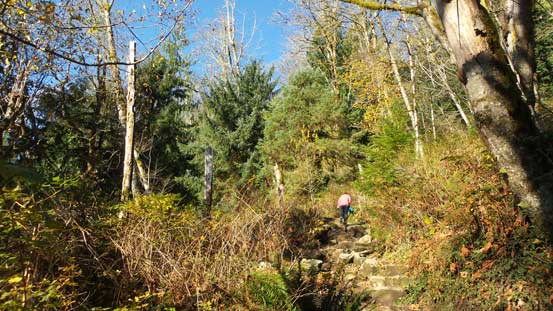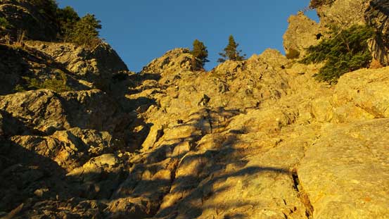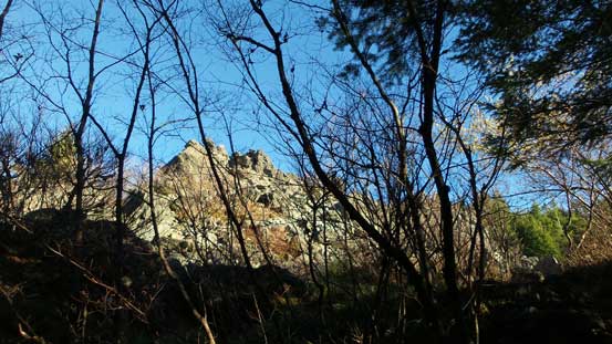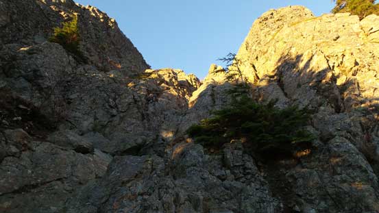 The summit block, also known as the “Haystack” loomed impressively in front of me and I wasted no time but going for it. On the way towards its base I stayed more or less on the ridge crest overcoming some boulder fields but there’s actually a good climber’s trail down on the right side (which I discovered on the return). Once at the base I traversed to its right and joined the trail. It led me diagonally traversing around a wooded bench to the base of that class-3 gully. The gully was a bit longer than I thought but quite straightforward as of the 3rd class rating. For more fun I opted for a harder step about midway up stemming up a small chimney feature. Once topping out there’s still one short stretch of scrambling to reach the true summit, easy technically but a bit exposed.