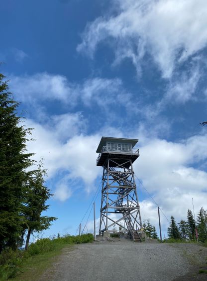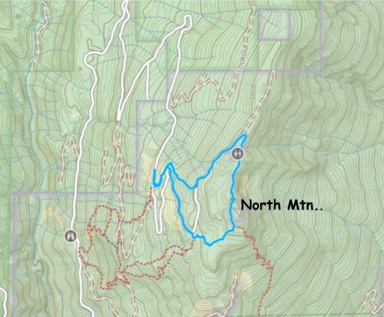 By now I was already a ways up the trails and I figured the chance of encountering downhill bikers on a Thursday would be low enough to take the risk. Right away I was glad that I did not do this objective by way of biking because these trails would be way over my head. At times I had to scramble up class 2 steps and I could not imagine having to ride those sections. A while later I intersected the uppermost spur and followed it due NE towards the lookout tower. The hike might seem innocent on the maps but it was not “nothing”. I did not carry anything and I almost regretted. The hike eventually took 1.5 hours and I should have at least carried a water bottle. Anyway I followed the road to the lookout tower and climbed to as high as I humanly could. The very top of the structure was locked, but I was still able to get some unobstructed views. While standing on the tower I should be higher than the true summit which lies about 1 km to the south, but man-made structures do not count as part of the mountain, so I must traverse south to the true summit to claim this peak. The traverse was done on another biking trail and the very top was attained by a short bushwhack. It wasn’t very obvious where’s the highest point, so I tagged a few contenders and the traverse among them required more bushwhacking. It’s this section that earned a “bushwhacking” icon on the peakbagger.com report.