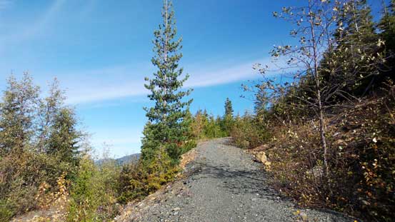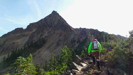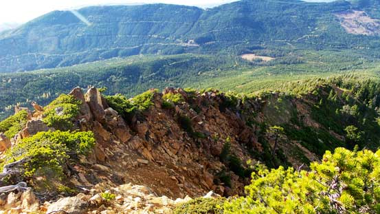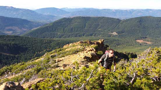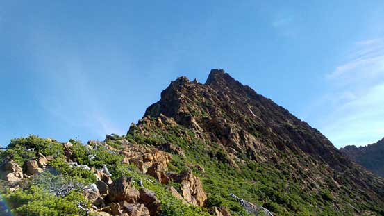 From the junction we took the left branch which looked bushy initially but soon got better. The next 2-3 km up this spur was a pleasant walking and in short time we arrived at the end of this complicated logging road system approach. The trail started right there and was marked by a cairn. We followed it through a section of young grown fairly effortlessly (would be horrendous bushwhacking without the trail), up a mature forest and then the forest thinned out and we could see our objective ahead. The ridge leading to the base of the W. Ridge was a little bit bushy but relatively short-lived. At the base we ditched some unnecessary gears, and then the scrambling started!