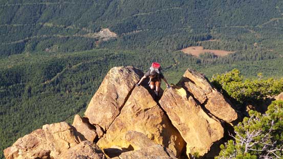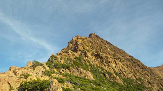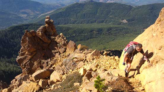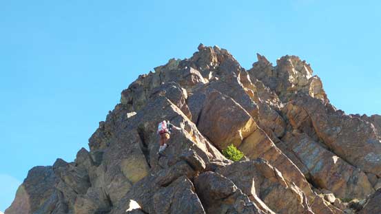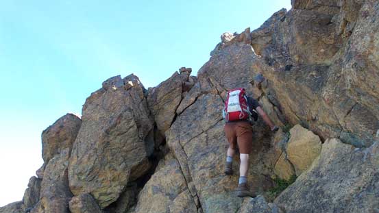 There’s actually not too much to describe about this scramble. As mentioned earlier the rock is super solid and grippy and on top of that, there’re plenty of holds and most of them are positive holds. The route basically follows the ridge crest and detours to the right (sometimes) or left (occasionally). With good route-finding it shouldn’t get any harder than Class 3 but there’s plenty of opportunity to make the route harder and we did so a few times since the rock was so good. About 2/3 of the way up we bypassed an imposing pinnacle on the right side. The upper 1/3 seemed to drag on forever and the easiest route through the next major wall was on the left traversing on a down-sloping ledge.
