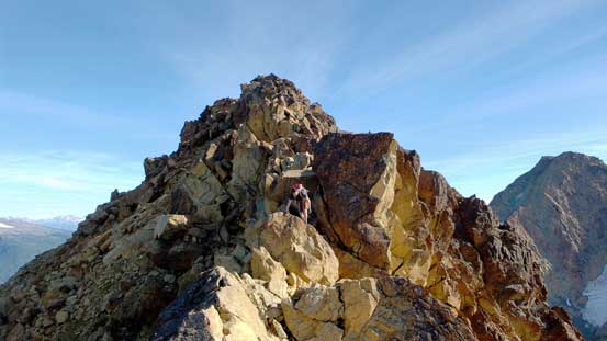 The descent route described in Matt Gunn’s book was a steep snow slope on the north face, but for us that’s no longer the option (as expected after a long dry summer). There’s basically no snow at all except for a few small dirty patches and the rock looked horribly loose and cemented by some frozen hard dirt. Down the W. Ridge we went, it was just as fun as on the ascent with a lot of stemming, “crab-walking” and a bit of down-climbing here and there. We managed to stay on the easiest line for most of the descent.