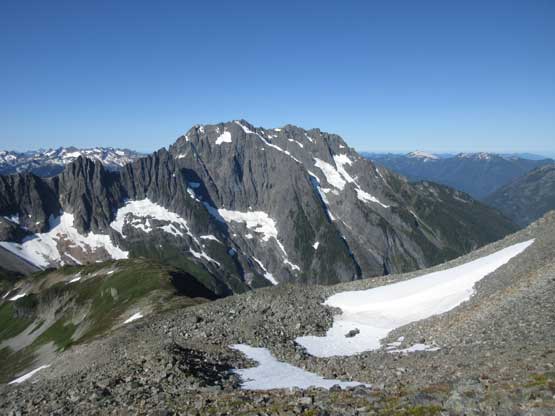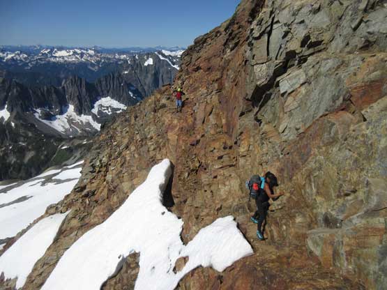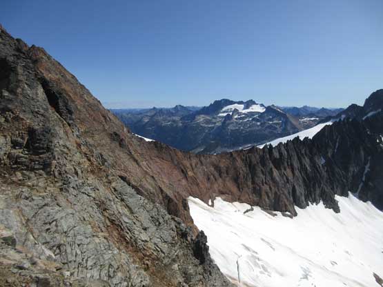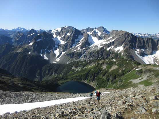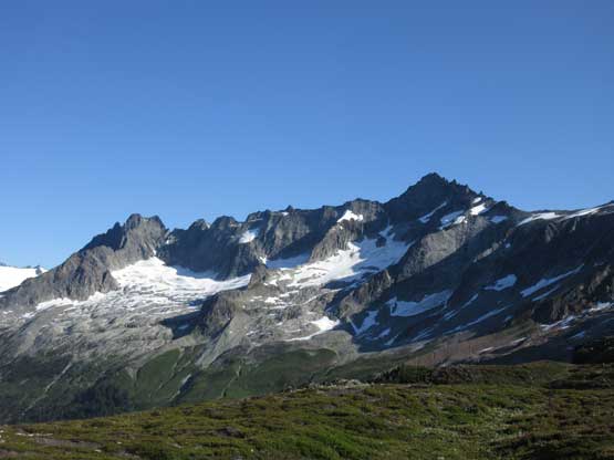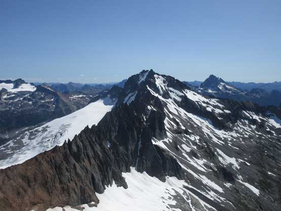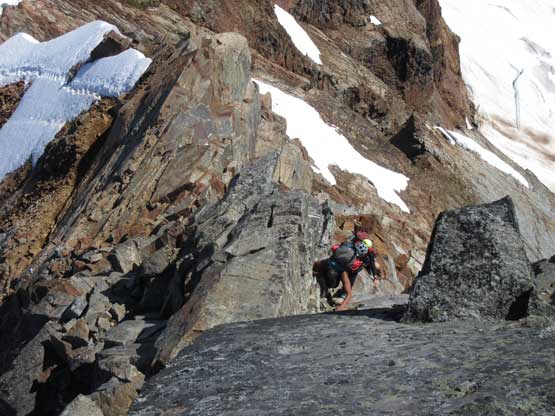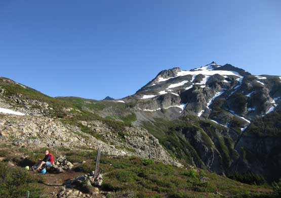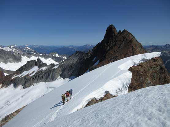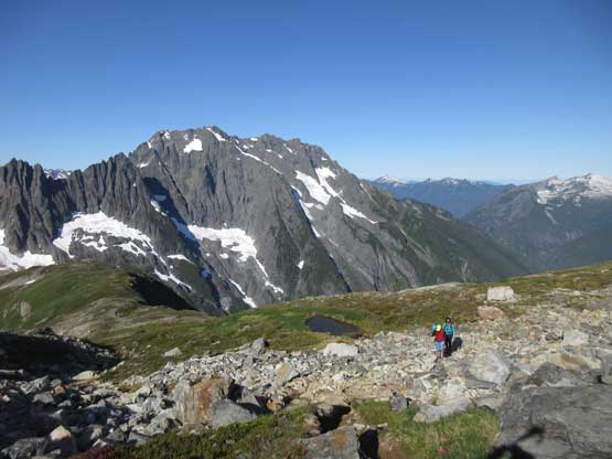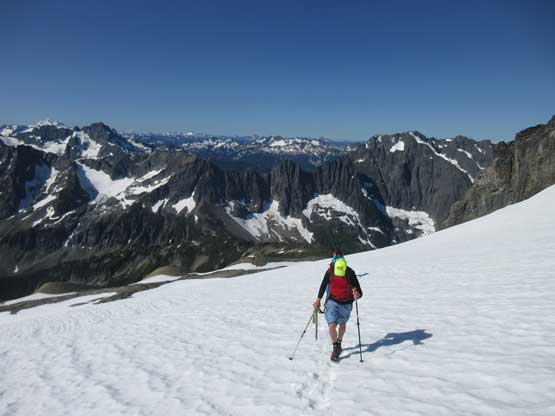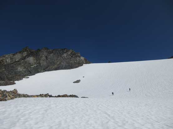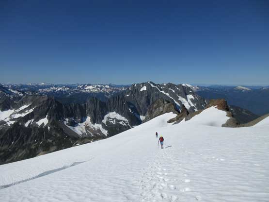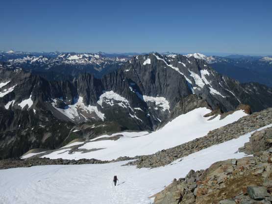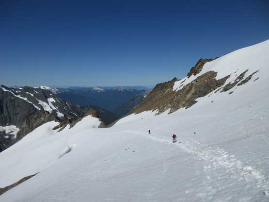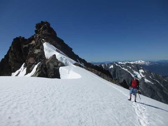 Not doing unnecessary lingering we passed a guided group of 3 climbing Sahale Peak from the north side, then continued onward towards our main objective – Boston Peak.