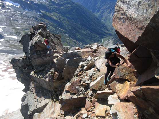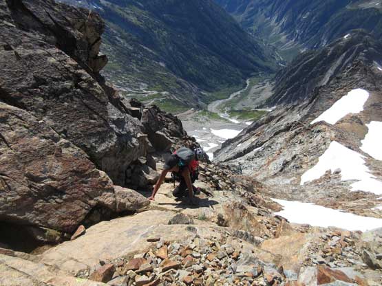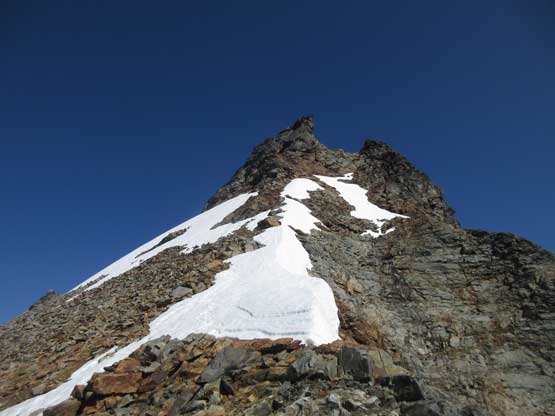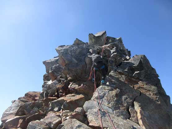 There was some loose, class 2 terrain to ascend before making to the base of the summit block. I did my homework researching the attack on the summit block and the correct route went around on the east side. We scrambled up increasingly-exposed class 3 terrain on ledges but with loose rocks over to the east side, then climbed one short class 4 move to reach a rappelling station. From there on the route continued traversing in a counterclockwise direction around the summit block to the NE side and the final scramble to the summit was class 3-4 with notable exposure.