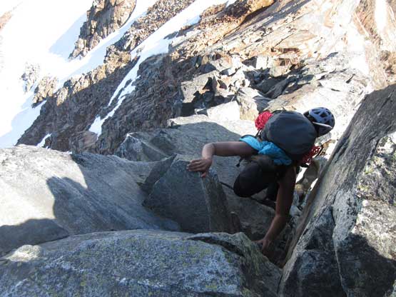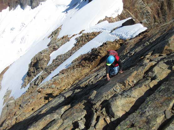 The ascent onto Sahale Glacier looked steep but was actually not, at maximum 30-35 degrees. With previous parties’ foot steps we did not have to use ice axe nor crampons at all. There was one crevasse that required a bit of detouring to get around but other than that, this glacier was tame and trivial. In no time we were at the base of Sahale Peak’s SE Ridge ready for some scrambling.