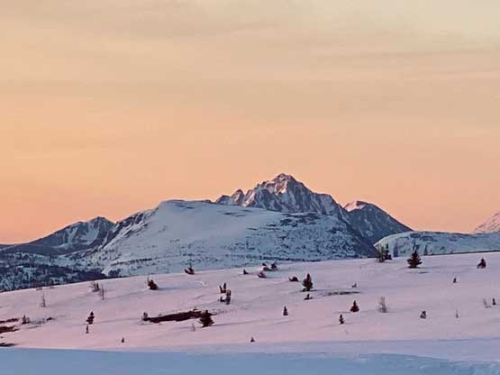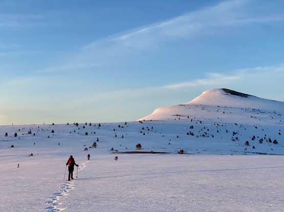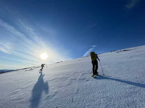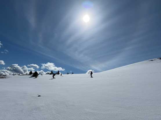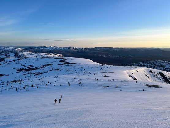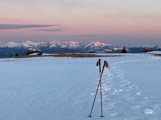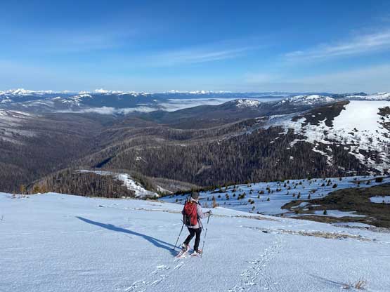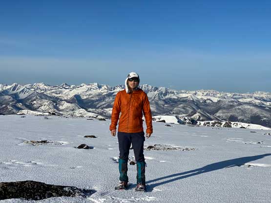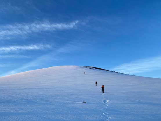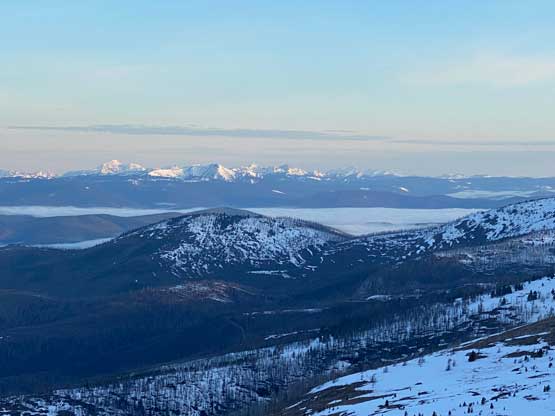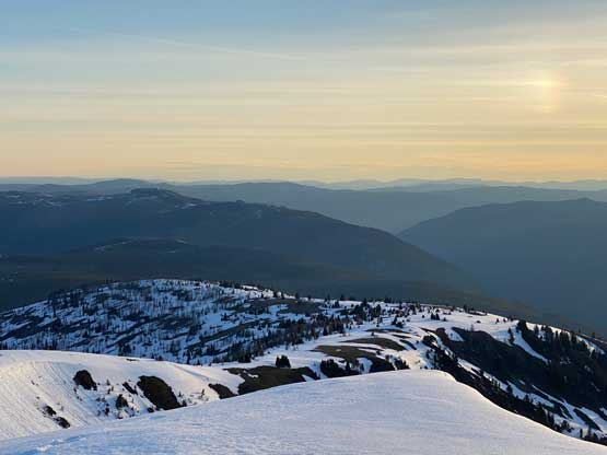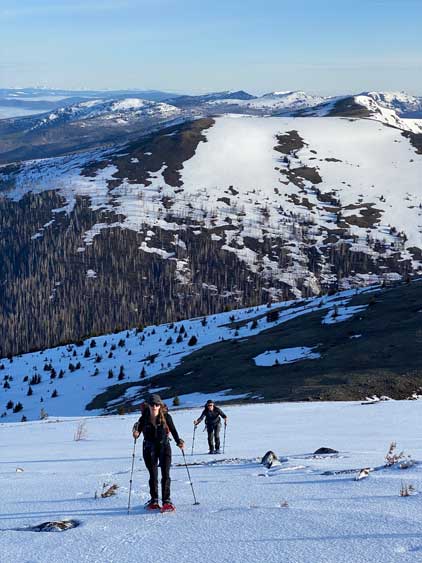 There’s one substantial bump on the north ridge of Sheep Mountain that’s not so obvious while ascending. I noticed that beforehand by studying the maps so started a traversing bypass roughly from 50 m under the bump. The others mostly went up and over the bump, so even though I was the 4th in the line struggling to keep up I ended up being 2nd in the line after this bump. We then had a stretch of steep snowshoeing to ascend out of this broad-ish notch onto the uppermost north ridge. The rest of the ascent was easy and uneventful, but seemed to drag on for a long time. Our ascent time was over 3 hours.