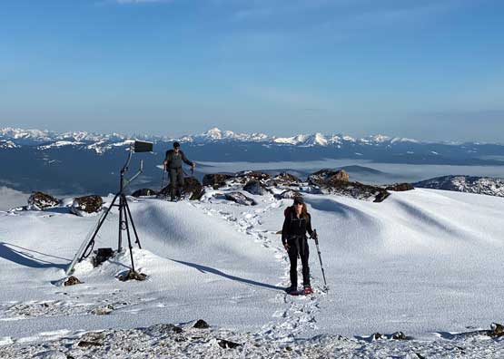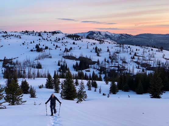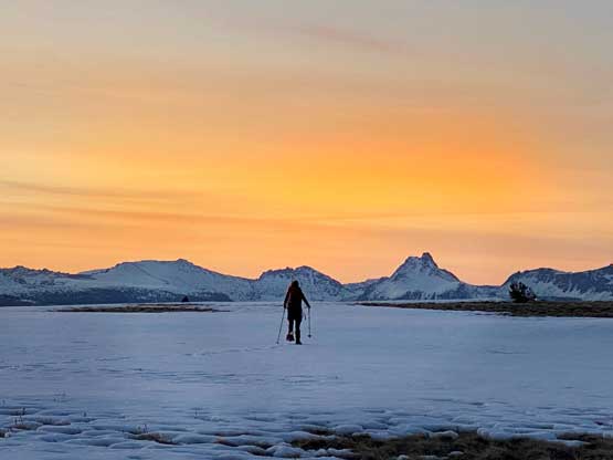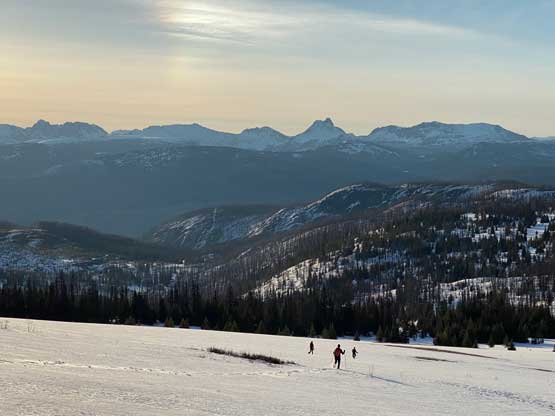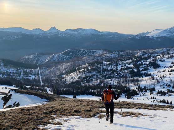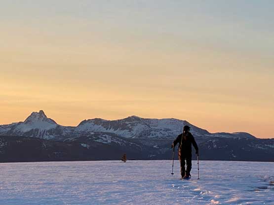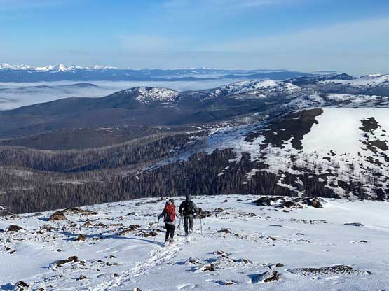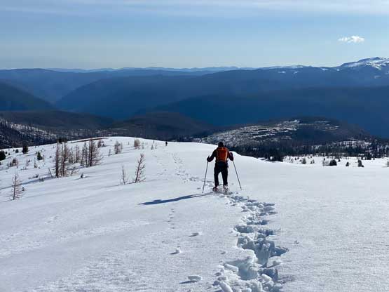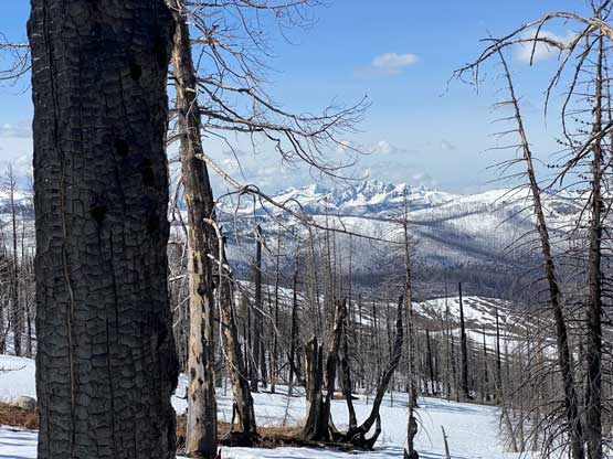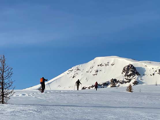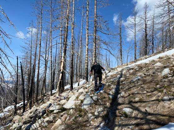 The views had been amazing so we lingered on the summit for at least half an hour before the coldness forced us to retreat. Thankfully the crust had started to break down so the tips of my snowshoes didn’t catch that relentlessly on the descent. In short time we all plunged down to Park Pass and now we had to face that 250-m elevation gain back up the south-east side of “Border Lake Peak”. The lower 200 m regain was unavoidable and then we opted to bypass the very summit by contouring on the west side. This saved us a little bit of work. I then led a downwards traversing line post-holing every single step forward (at times, thigh deep) to re-join our own tracks. Once onto the morning tracks the post-holing situation improved. We then had a cruise sailing down the north flanks of “Border Lake Peak” into the forest. To navigate the open, burnt forest we had to consult with the GPS numerous times to make sure we stayed on our route, as the snow wasn’t continuous so we couldn’t just blindly follow our own foot prints. In total we had practiced the snowshoes-to-foot and foot-to-snowshoes transitions at least 20 times on this day, so everybody was becoming faster in the end, which was good.