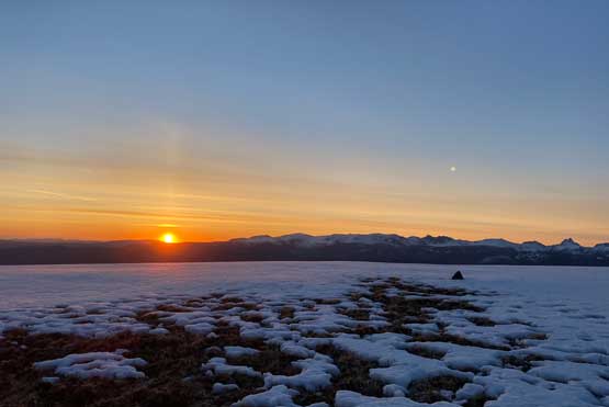 The road system was not labelled in Gaia’s topo map, but is correctly labelled in the Backroad Mapbook layer of Gaia GPS. To use this layer one has to pay some subscription but compared to the just the gas $$ to drive this far this additional cost is literally nothing, so don’t ask me about the driving portion. Buy your subscription and do your own navigation. I did not even track the FSR anyway. The place where we parked was very wet and muddy such that nobody beside Phil was keen to set up the tents. Elise and I simply just slept on the truck’s driver and passenger seats and that actually worked out decently. The alarm was set at 3:30 am so needless to say that was quite a push. Francis and Phil didn’t sleep much at all but Elise and I did catch at least 1 hour of intermittent sleep. The condition was already much less snowy than a week prior but we could still see the faint ski tracks left by Matt’s party. We had to carry the snowshoes for about 10 minutes before reaching continuous snow. The snow condition was horrible as expected. Even at 4:30 am in the dark we were sinking through the breakable crust and at times, pure slush. The radiation freeze at night (thank to clear skies) was not enough to form a supportive crust to hold our weight. As a result the progress was slower than expected. I was hoping to watch sunrise on the summit of “Border Lake Peak” but ended up having to watch sunrise on its broad north ridge, which was still very impressive. This was just after 5 am in the morning.