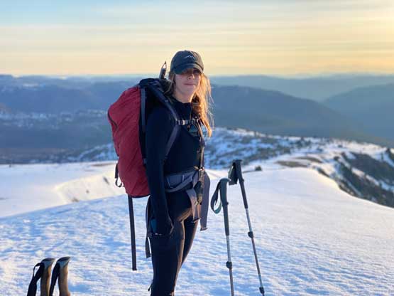 Elise descending a long stretch of dry ground holding snowshoes