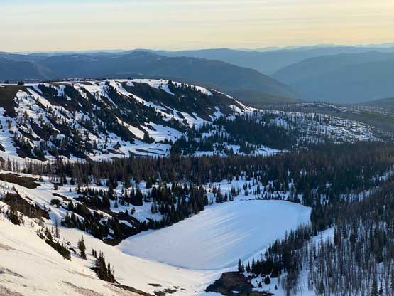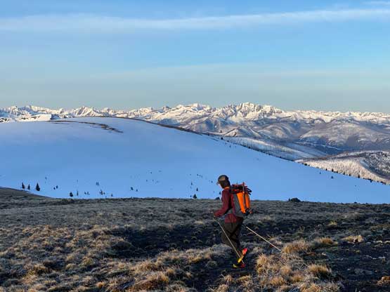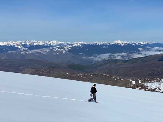 After a brief break on the summit of this rather sub-peak we continued southwards crossing into Washington’s Pasayten Wilderness. There’s an unavoidable 200+ meters of descent into Park Pass. We carried the snowshoes for much of the upper half but the bottom zones were on continuous snow. Again, the conditions were very shitty. Each of us was post-holing on top of the previous person’s tracks. Elise was the only one able to mostly float on top of the crust and Francis was sinking thigh deep. I was fine with the added post-holing, but my MSR Lightning Ascents had too many crampons and they relentlessly caught the crust. That was fine on the uphill stretches, but became really frustrating when the orientation went downhill. The moment I didn’t pay attention or I wanted to go a little bit faster I would trip and fall. The snow on Sheep Mountain’s lower north ridge was a little bit more supportive, thankfully.
