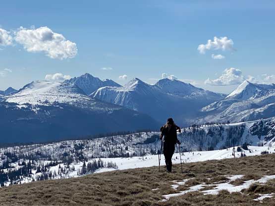 Elise plodding back up with Remmel Mtn. and Andrew Peak behind