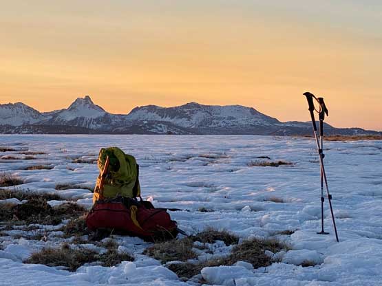My pack with Cathedral Peak and Amphitheatre Mountain on the skyline
