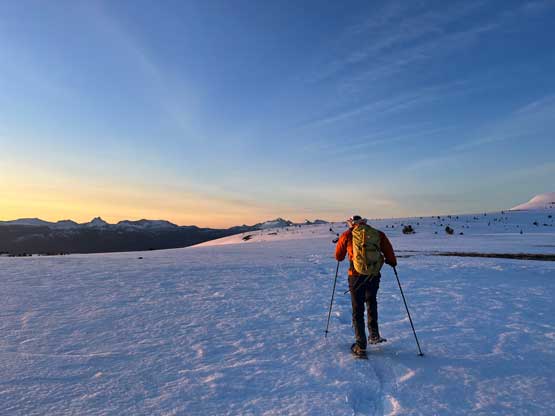 The views had been amazing so we lingered on the summit for at least half an hour before the coldness forced us to retreat. Thankfully the crust had started to break down so the tips of my snowshoes didn’t catch that relentlessly on the descent. In short time we all plunged down to Park Pass and now we had to face that 250-m elevation gain back up the south-east side of “Border Lake Peak”. The lower 200 m regain was unavoidable and then we opted to bypass the very summit by contouring on the west side. This saved us a little bit of work. I then led a downwards traversing line post-holing every single step forward (at times, thigh deep) to re-join our own tracks. Once onto the morning tracks the post-holing situation improved. We then had a cruise sailing down the north flanks of “Border Lake Peak” into the forest. To navigate the open, burnt forest we had to consult with the GPS numerous times to make sure we stayed on our route, as the snow wasn’t continuous so we couldn’t just blindly follow our own foot prints. In total we had practiced the snowshoes-to-foot and foot-to-snowshoes transitions at least 20 times on this day, so everybody was becoming faster in the end, which was good.