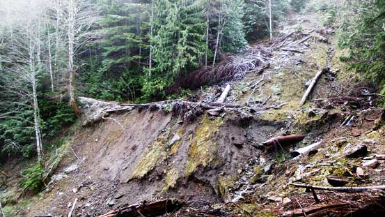 We woke up around 6 am and after a bit of slow-going things we eventually sorted everything out by 6:40 am. The road was no longer drivable beyond the first switchback (big barricade), and soon enough it started to get grown in. There’s nothing “bushwhacking” speaking the alders or other species that frequent the overgrown logging roads, but whatever presenting was wet thank to the previous few days’ of rain. None of us was equipped with rain pants and Vlad even forgot his gaitors so you know what’s going to happen. We both got soaked through even before hitting snow and that was not very motivating considering the long day ahead. In addition to the “very light bush” there were two major wash-outs that we easily negotiated. And then we encountered some deep, patchy snow that could not support our weight. The snowshoes were tediously strapped on and off for at least three times and in between we just carried them on hands. Eventually after what seemed like a long haul we came to the end of this forestry road. The trail was pretty easy to miss but Vlad paid more attention to details and spotted it on.