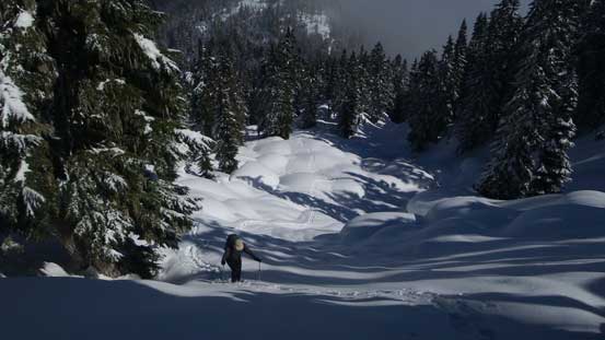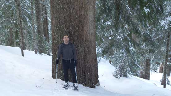 Now we had finally done all of the up-and-downs and we still had more than 1000 vertical meters to descend. The rain crust in the lower forest surely did not help our speed and once the grade steepened up it was especially awful. Every step was on the knees. The bright side was that we managed to stick close to the trail and avoided that crappy dead-fall mess lower down. Overall the descent was faster than expected. Hitting the forestry road we decided to short-cut the uppermost switchback to avoid that “snowshoes-on-and-off” stretches. Nobody was in the mood to strap the ‘shoes on again and bushwhacking for 300 m distance was much more inviting. It turned out that the bush was pretty easy going. We thought about short-cutting the next one too but checking my GPS we abandoned that idea as the terrain looked steep and cliffy, so leisurely walked the few kilometers back to the truck.