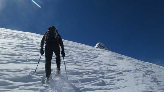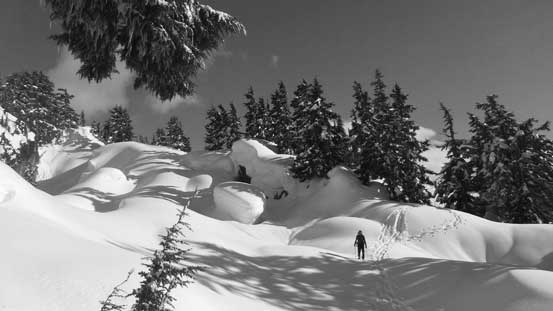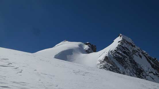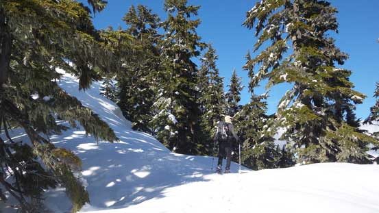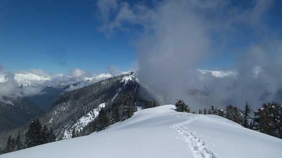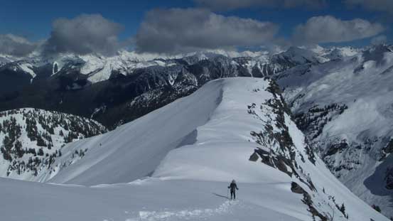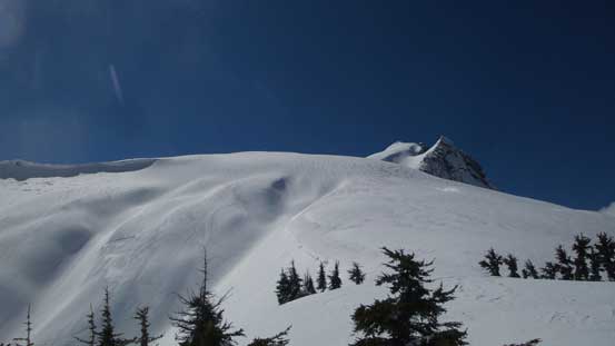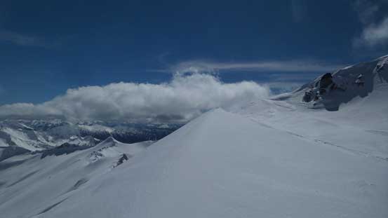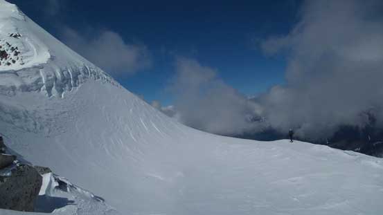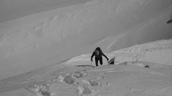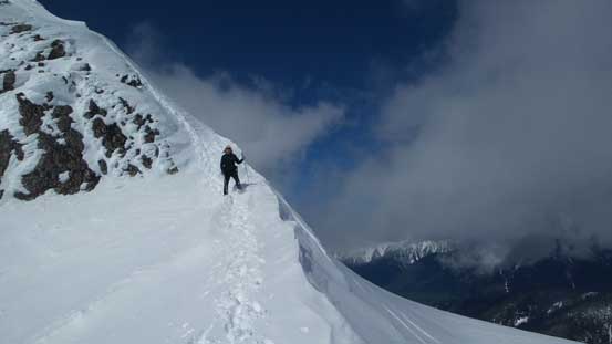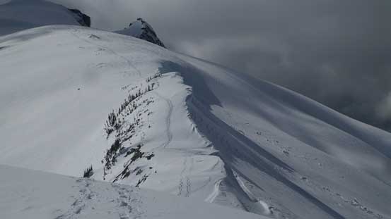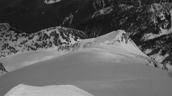 Traversing this bench to access the very upper S. Ridge to gain the summit