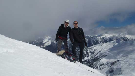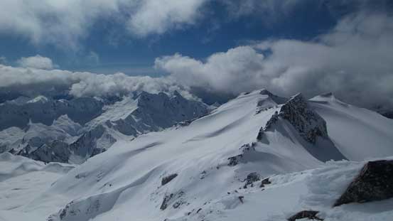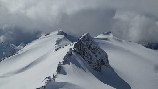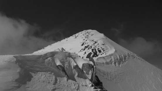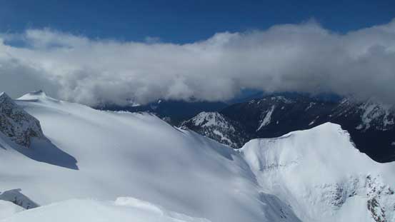 The glacial plod was surely a long one but at least we knew we were slowing getting there. The summit pyramid looked pretty steep but upon close inspection it wasn’t too bad. We decided to attack it from climber’s left (south side). Apart from one short steep section there’s not much worth noting. The last 10 m before the summit was incredibly ice though hence it was a good call to haul the crampons this far up. Unfortunately some clouds rolled in and most big peaks were already engulfed in especially looking towards the Cascade Pass group. After working so hard to get here this was downright disappointing but at least there were still plenty of blue skies so it was still acceptable.