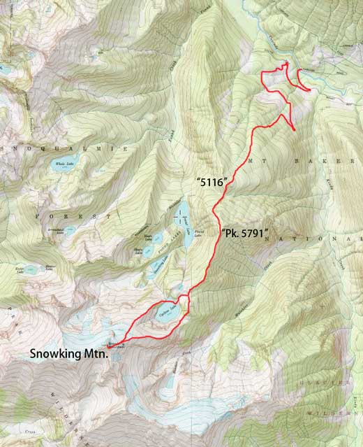 Beyond this point we kept a diagonally traversing bearing towards climber’s right and eventually crested the start of that broad, forested Kindy Ridge and that marked the start of a long plod towards the first highpoint of the day (“Pk 5116”). The grades were no longer steep, the snow was continuous and the forest was widely open, but the slog was very monotonous. Traversing the east side of “Pk 5116” we encountered some steep and crusty terrain which forced us to go back up to the top of this little peak, followed by another steep descent down to 5116/5791 saddle. Grunting up “Pk 5791” the trail-breaking finally took over but at the same time, the views finally opened up. We opted to not ascend to the summit and instead, traversed around it on west side near the top, and once around a corner we got a head-on view of the route ahead which not to our surprise, was still a long ways away…