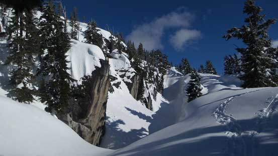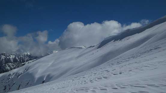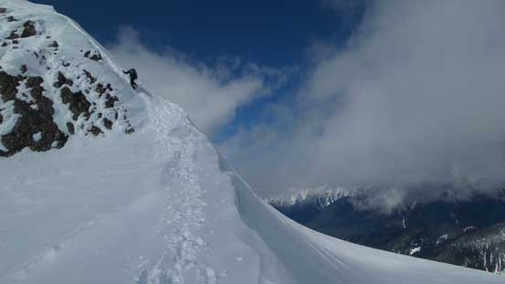 Traversing this bench to access the very upper S. Ridge to gain the summit