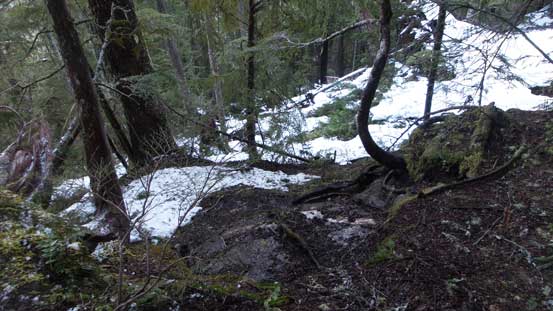 Now we had finally done all of the up-and-downs and we still had more than 1000 vertical meters to descend. The rain crust in the lower forest surely did not help our speed and once the grade steepened up it was especially awful. Every step was on the knees. The bright side was that we managed to stick close to the trail and avoided that crappy dead-fall mess lower down. Overall the descent was faster than expected. Hitting the forestry road we decided to short-cut the uppermost switchback to avoid that “snowshoes-on-and-off” stretches. Nobody was in the mood to strap the ‘shoes on again and bushwhacking for 300 m distance was much more inviting. It turned out that the bush was pretty easy going. We thought about short-cutting the next one too but checking my GPS we abandoned that idea as the terrain looked steep and cliffy, so leisurely walked the few kilometers back to the truck.