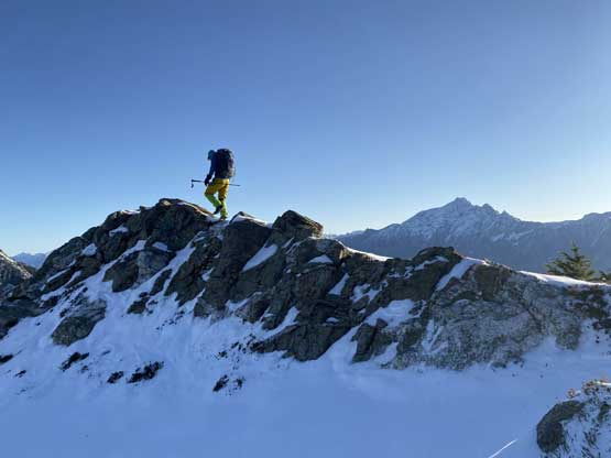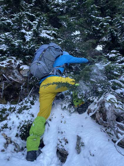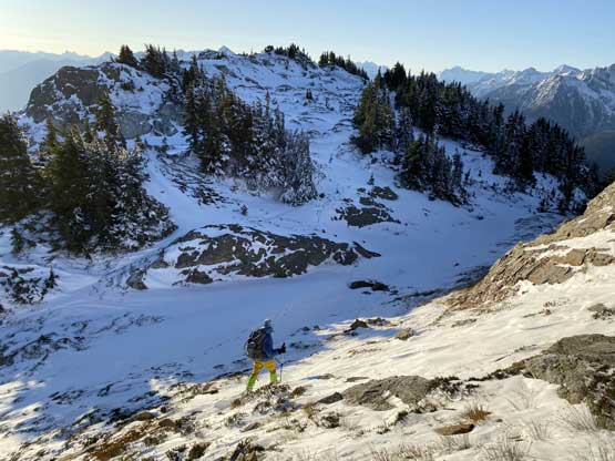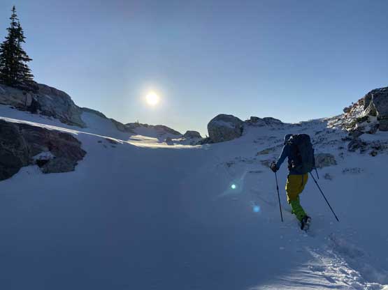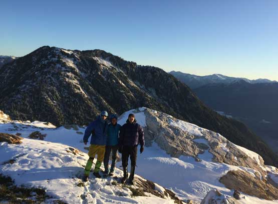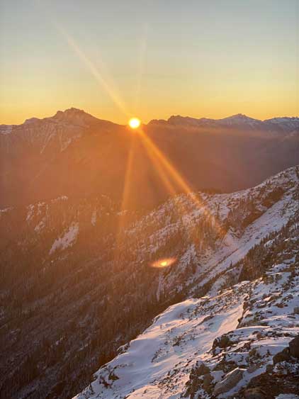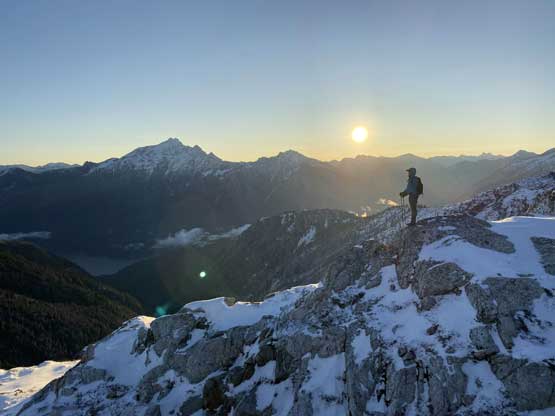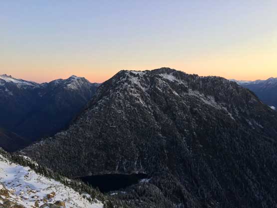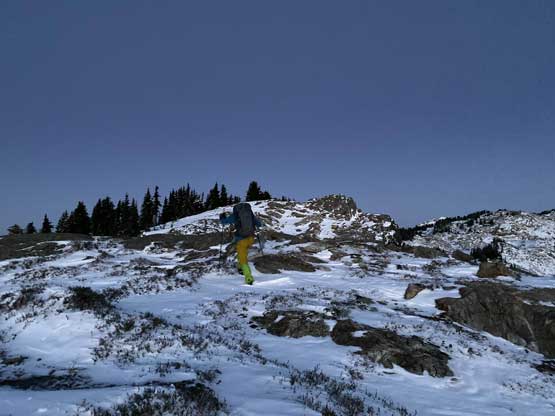 The grunt to the upper south-east ridge took longer than expected, that by the time we got there the sky was already getting a little bit bright. We turned left to ascend the true summit first, and right off the bat we encountered knee-deep wind drifts. There was no trail anymore and the post-holing was slow and tiring. Thankfully we could stay on the bare ground for at least half of the distance. The ascent required traversing over a few subsidiary summits including a major dip with more than 30 m elevation loss and route-finding. That drop also required some 3rd class bushwhacking (with fresh snow) and was annoying to say the least. Beyond that we raced to what we thought was the summit, post-holing as fast as we could in order to be there in time for alpenglow. We did manage to get there in time and watched an incredible sunrise, but another bump down the ridge definitely appeared higher.