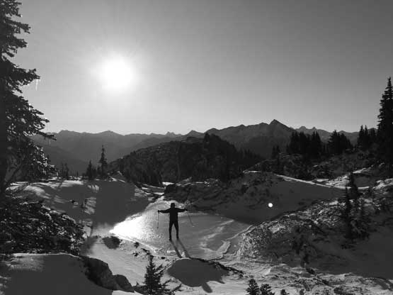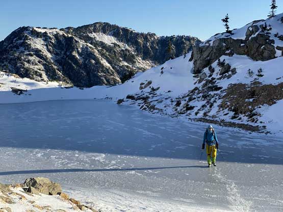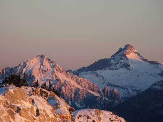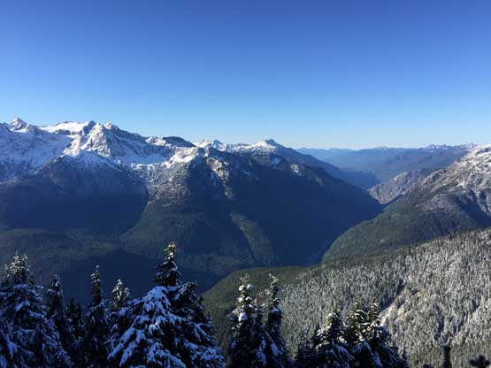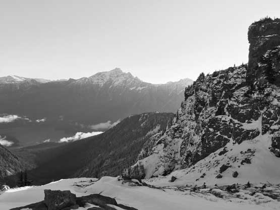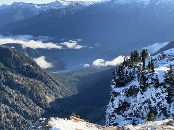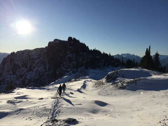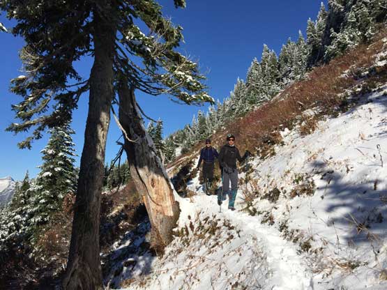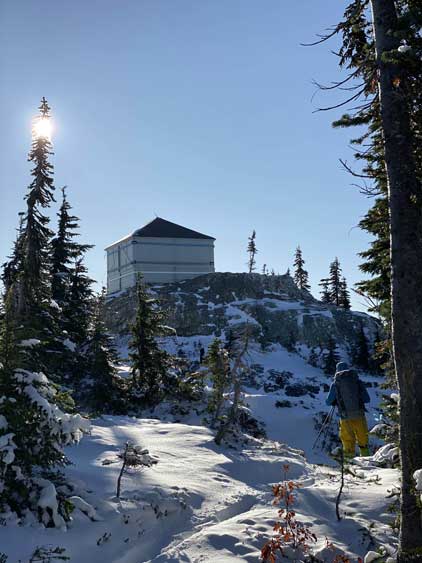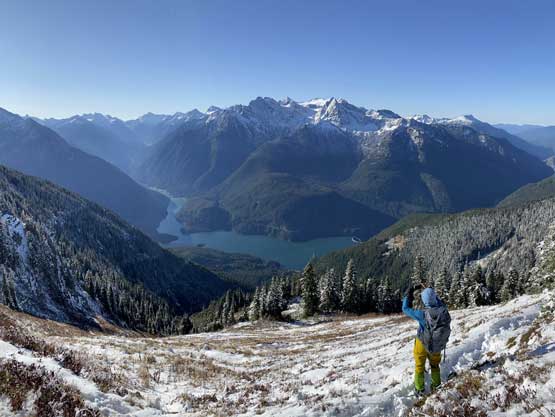 As the sun warmed things up we slowly started the return hike, taking a shit ton load of photos on the ridge. At the trail junction Vlad suggested we should also tag the lookout site. I wasn’t sure about that because we were in a time constraint, so agreed only if someone else offered to break trail. Vlad volunteered to break trail and in about 20 minutes we were on the lookout site. The structure was locked but the views were worthwhile. We got to see a bit of different things including the double-summits of Hozomeen Mtn., the north face of Davis Peak and the deep valley that the North Cascades Highway travels westwards into.