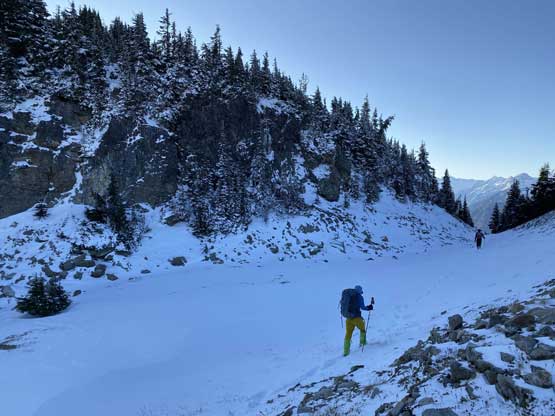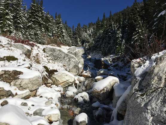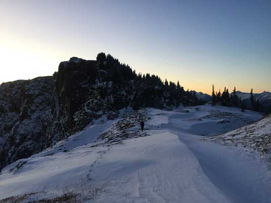 It took us a few minutes to locate the trail in dark as it’s behind a house. The trail was in an excellent shape and the grade was very good – not too steep and not too flat neither. We made progress in good time. I on purposely kept our pace down because we had about 4 hours till sunrise and didn’t want to freeze our asses off while waiting on the summit. We started encountering fresh snow at around 1000 m elevation and the snow became continuous at around 1300 m once starting the traverse into Sourdough Creek drainage. It was here that the trail condition also degraded but for someone coming from BC this was still considered an “excellent” trail. The fresh snow was about boot-top and the brushes were wet. We took our one (and the only) break along this section. The crossing of Sourdough Creek was a little bit confusing in the dark but we came prepared with a GPS track so no big deal. After a good while of traversing we came to a large opening area (although nothing to see) and more switchbacks.