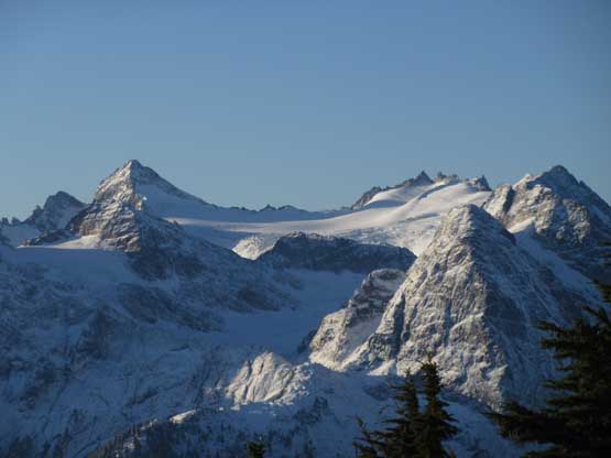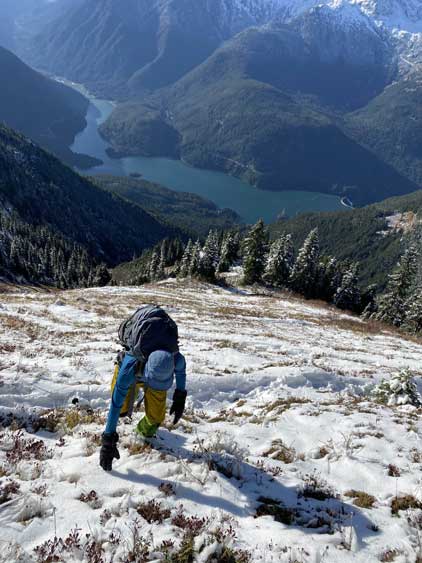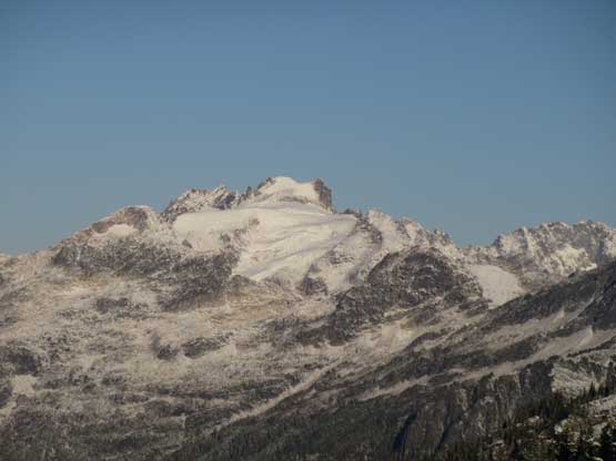 It was past 9:30 am and we had to hurry up. We made quick work down to the trail junction and then into the south side basin. The opening area with switchbacks offered excellent views of Diablo Lake with Snowfield Peak group behind as a backdrop. After that we were in the woods, and the plod seemed never-ending.. We got back to the parking lot in about 2 hours after leaving the lookout site, making a total round trip time just over 8 hours.