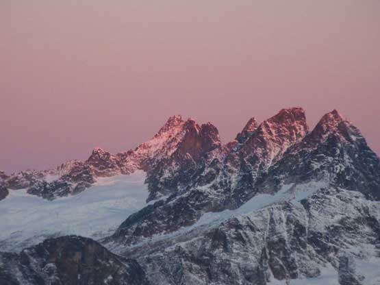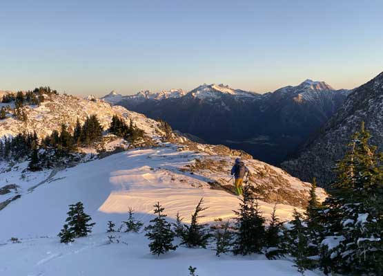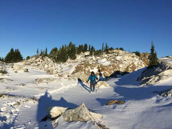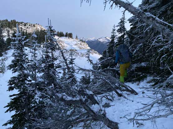 The grunt to the upper south-east ridge took longer than expected, that by the time we got there the sky was already getting a little bit bright. We turned left to ascend the true summit first, and right off the bat we encountered knee-deep wind drifts. There was no trail anymore and the post-holing was slow and tiring. Thankfully we could stay on the bare ground for at least half of the distance. The ascent required traversing over a few subsidiary summits including a major dip with more than 30 m elevation loss and route-finding. That drop also required some 3rd class bushwhacking (with fresh snow) and was annoying to say the least. Beyond that we raced to what we thought was the summit, post-holing as fast as we could in order to be there in time for alpenglow. We did manage to get there in time and watched an incredible sunrise, but another bump down the ridge definitely appeared higher.
