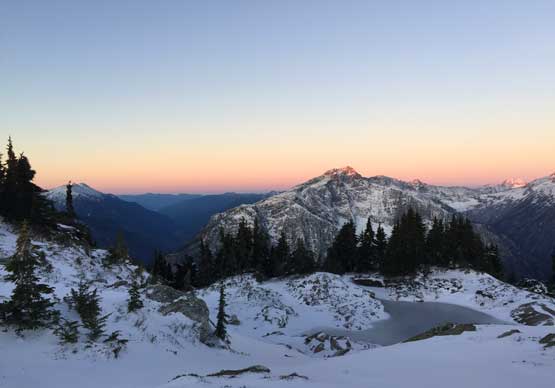 It took us a few minutes to locate the trail in dark as it’s behind a house. The trail was in an excellent shape and the grade was very good – not too steep and not too flat neither. We made progress in good time. I on purposely kept our pace down because we had about 4 hours till sunrise and didn’t want to freeze our asses off while waiting on the summit. We started encountering fresh snow at around 1000 m elevation and the snow became continuous at around 1300 m once starting the traverse into Sourdough Creek drainage. It was here that the trail condition also degraded but for someone coming from BC this was still considered an “excellent” trail. The fresh snow was about boot-top and the brushes were wet. We took our one (and the only) break along this section. The crossing of Sourdough Creek was a little bit confusing in the dark but we came prepared with a GPS track so no big deal. After a good while of traversing we came to a large opening area (although nothing to see) and more switchbacks.
