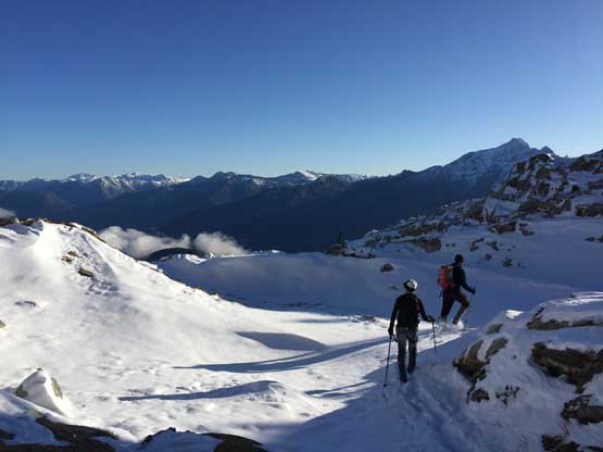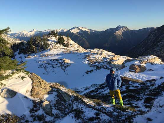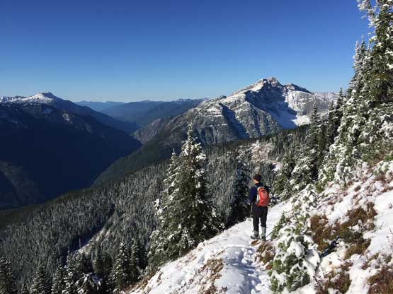 As the sun warmed things up we slowly started the return hike, taking a shit ton load of photos on the ridge. At the trail junction Vlad suggested we should also tag the lookout site. I wasn’t sure about that because we were in a time constraint, so agreed only if someone else offered to break trail. Vlad volunteered to break trail and in about 20 minutes we were on the lookout site. The structure was locked but the views were worthwhile. We got to see a bit of different things including the double-summits of Hozomeen Mtn., the north face of Davis Peak and the deep valley that the North Cascades Highway travels westwards into.