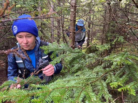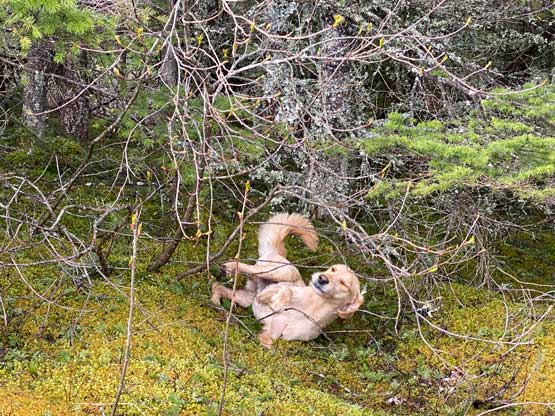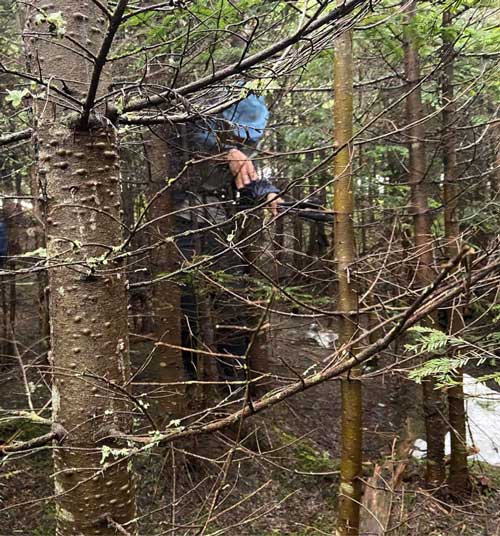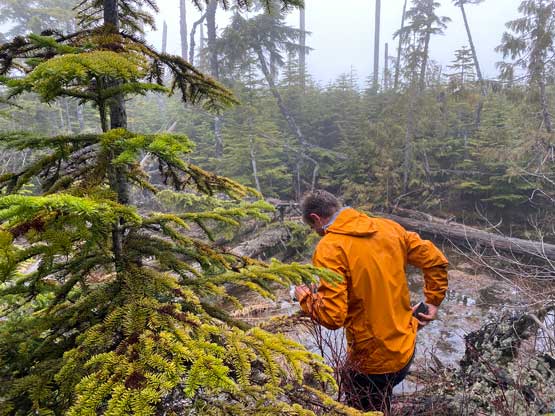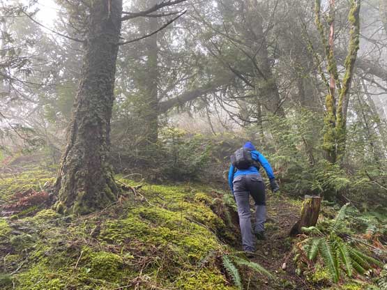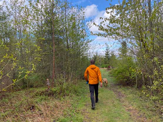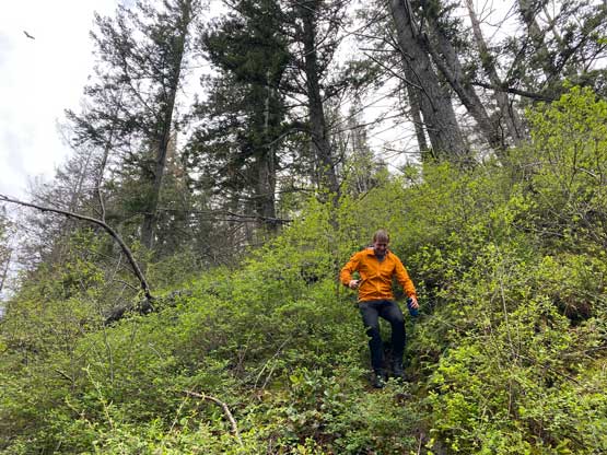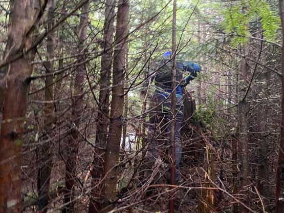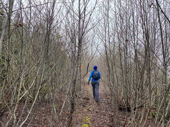 Upon reaching the next intersection we turned right losing fair a bit of elevation to descend onto an overgrown logging road on this upper Sumas Mountain’s plateau. The upper reach of this hike was the worst of all. We followed this road to as close to the true summit as possible but the last 100 horizontal meters had to be bushwhacked no matter what. The true summit was basically in the middle of a re-planted zone and the young trees were extremely dense. I could totally see how dumpster-ish this peak would be if one just did the drive-and-thrash but for us the suffering was only a small fraction of the total hike. It’s difficult to determine where exactly was the highest point so we just thrashed to where the “red dot” on the peakbagger app was and called it there. There’s absolutely no view whatsoever.