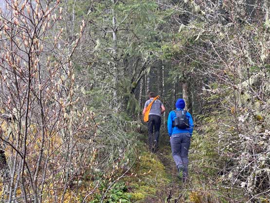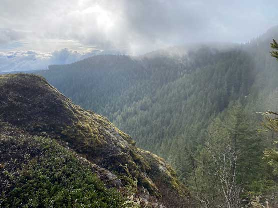 The parking and the start of this trail is actually in someone’s private property but the owner kindly put up a path for us hikers to go through, which we greatly appreciated as they could totally just close the area and put up “no trespassing” signs like most Canadian rural communities do. Right off the bat I realized that this hike might actually be a nice one. The ascent through the lower forest reminded me Squak Mtn. that I did recently in Issaquah area. The trail was muddy at places, but overall well-maintained and easy to follow. At the first junction we turned right towards the mine site and the plan was to take the cabin route on the way back closing in a loop. We then ascended a dozen switchbacks gaining elevation rapidly. By around 650 m elevation zone the slope angle finally mellowed out and then we had an easy plod onto the peak’s NW Ridge where we actually found a few nice viewpoints. Those who chose to drive up from Paradise Valley would miss out all these views. This NW Ridge section was the finest of the whole hike.