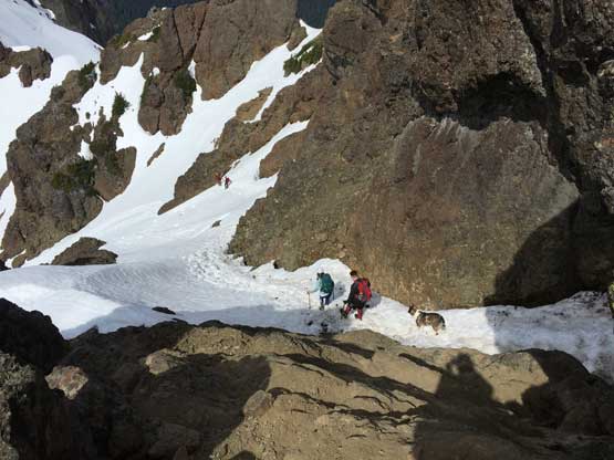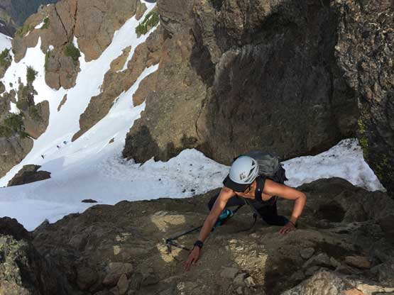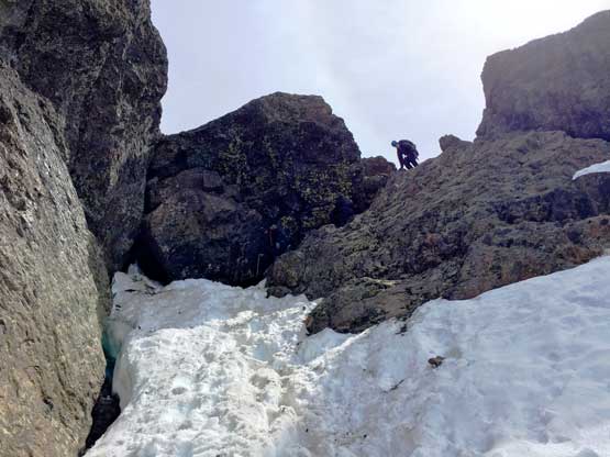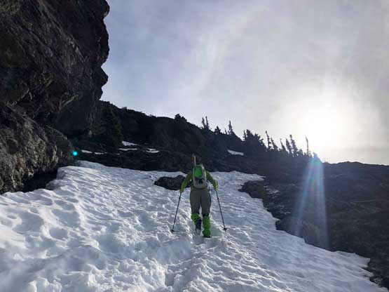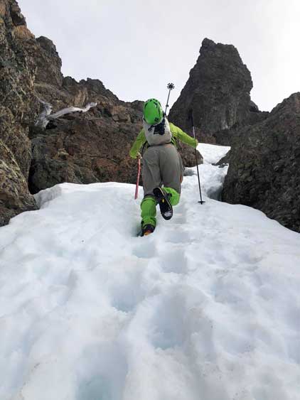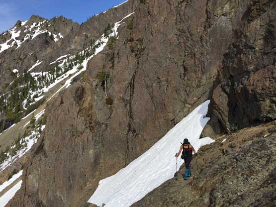 Me heading for a snow-to-rock transition, Photo by Mel O.