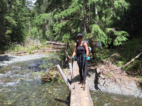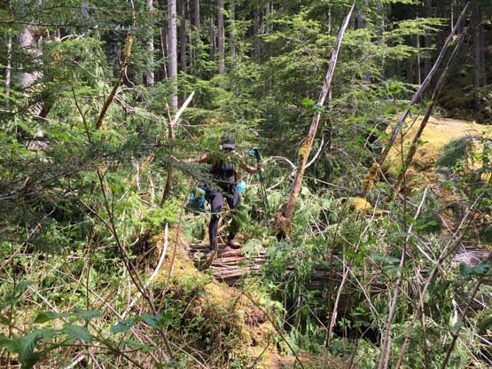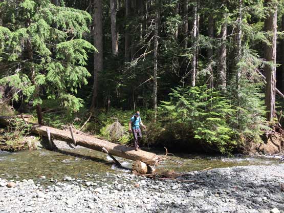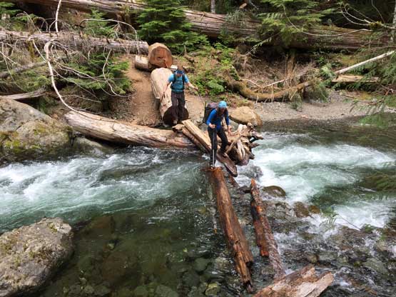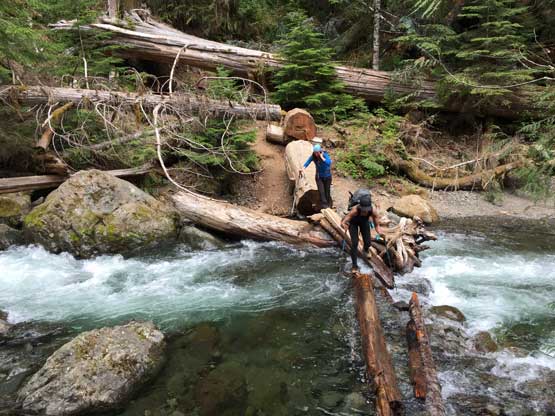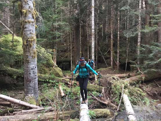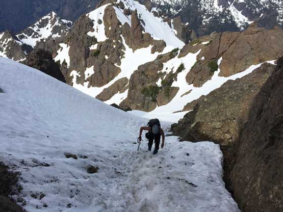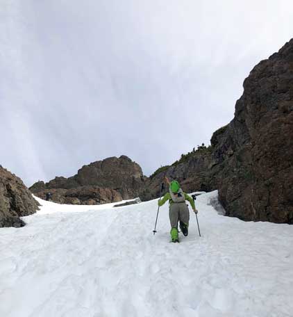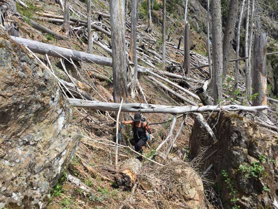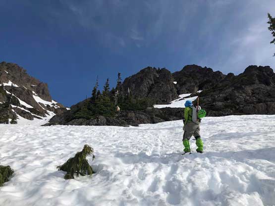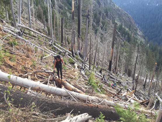 The climber’s trail beyond the camp was still in a decent shape. A few small creeks offered easy places to load up the water bottles (I carried no more than 200 mL of water on the entire approach because water’s everywhere). A while later we finally exited the woods but soon entered a burnt zone. The trail became confusing again and not to our surprise we completely lost it again and had to climb up and over many dead-falls to find it much higher up and way on climber’s left. Not much farther from here we hit snow and the snow soon became continuous. Mel and I found a dry rock island to finally ditch trail-runners and put the mountaineering boots on.
