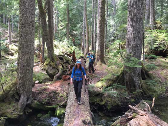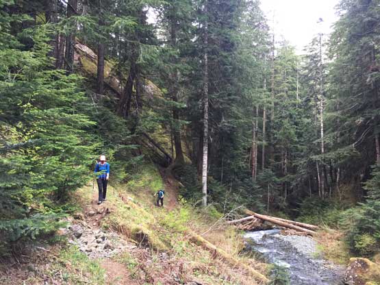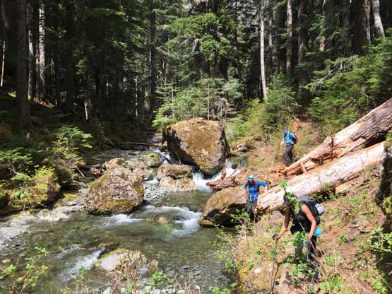 We managed to get less than 2 hours of sleep and then the alarm went off at 2:30 am. McKenzie and Chris showed up at around 3 am and we were soon on the endless switchbacks of Lena Lake trail. This is a very well-maintained trail and we made to Lena Lake in just over an hour, covering good amount of distance. The sky was getting slightly brighter now and we were facing the first challenge – the crossing of Lena Creek. I did not do much of research and was expecting at least a foot bridge given the popularity of this trail, but apparently that wasn’t the case. We even backtracked several times to search for a bridge but there’s none. It wasn’t very clear how the crossing was with headlamps on, that I simply took the shoes off and forded it. The others managed to tip-toe across a slippery log which was actually easier than appeared. A short bushwhack brought us back on the (now unofficially maintained) climber’s trail that followed East Fork of Lena Creek into “Valley of the Silent Men”. The quality of this trail was much better than expected but we still got totally lost in one zone. The GPS tracks didn’t help much neither as it seemed like people had all picked their own way. About 20 minutes of frustrating bushwhacking later we got back onto the trail, and had no further issue making to the climber’s camp, although the constant up-and-downs on this approach were annoying to say the least.