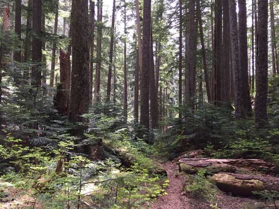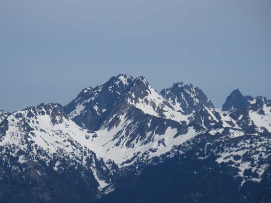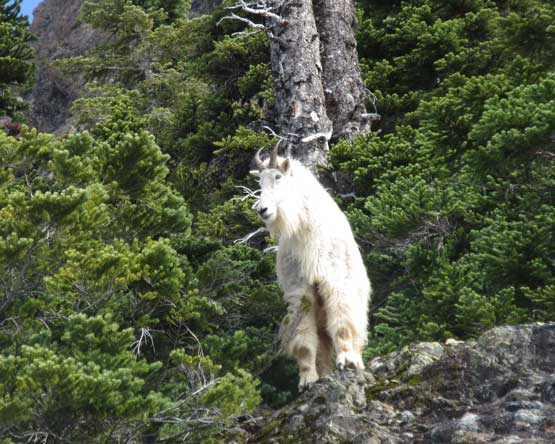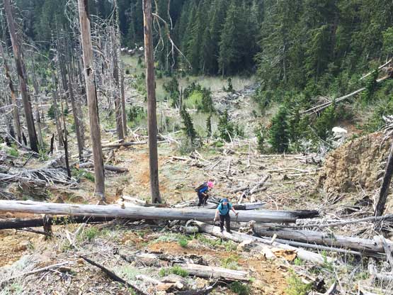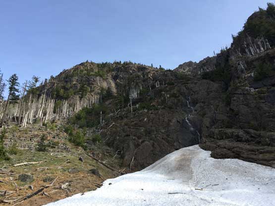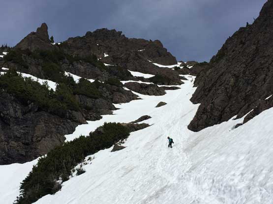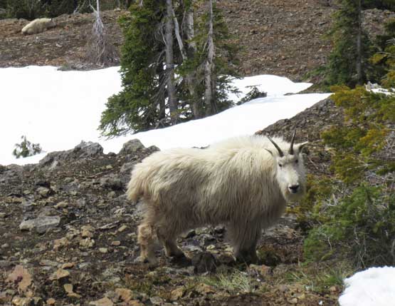 After staying for almost an hour on the summit we had to face the descent. Down-scrambling the crux was easy and then we got to enjoy a very fast plunge/boot-ski down the upper chute. We snapped some photos of the billy goats before going for another run down the lower snow gully. Once running out of snow Mel and I took another break transitioning gears. We unfortunately lost the trail again in that burnt forest and this time the punishment was bushwhacking in brambles. Lower down on the climber’s trail we paid close attention not to lose the trail again. We did manage to stay entirely on the “trail” through that confusing zone but had to climb up and over gigantic dead-falls which was probably just as painful as bushwhacking on the east side.. The rest of the hike-out was boring as fuck…