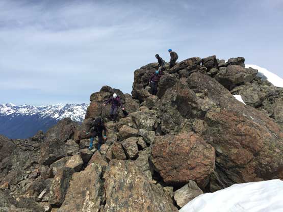 The snow became steep again near the summit block and the final obstacle was a short, but wet and down-sloping 3rd class rock scramble to get onto the “summit platform”. Once above the crux the summit was only 5 minutes away. It’s as busy as I was expecting but the stoke level was high among every one of us.