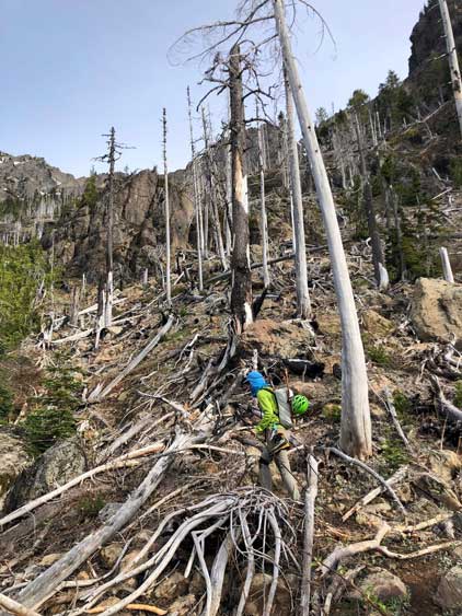 The climber’s trail beyond the camp was still in a decent shape. A few small creeks offered easy places to load up the water bottles (I carried no more than 200 mL of water on the entire approach because water’s everywhere). A while later we finally exited the woods but soon entered a burnt zone. The trail became confusing again and not to our surprise we completely lost it again and had to climb up and over many dead-falls to find it much higher up and way on climber’s left. Not much farther from here we hit snow and the snow soon became continuous. Mel and I found a dry rock island to finally ditch trail-runners and put the mountaineering boots on.