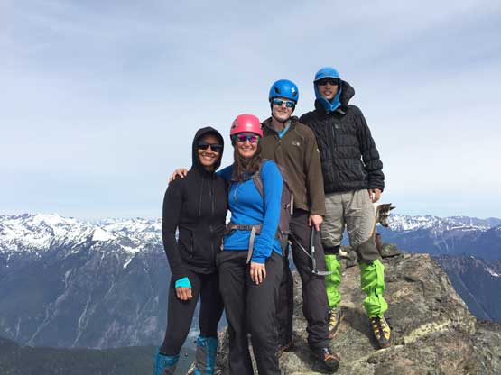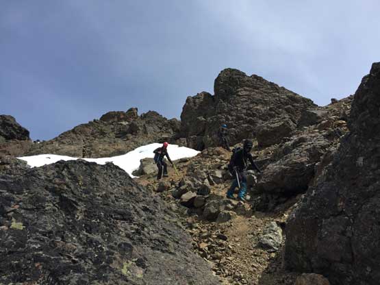 The snow became steep again near the summit block and the final obstacle was a short, but wet and down-sloping 3rd class rock scramble to get onto the “summit platform”. Once above the crux the summit was only 5 minutes away. It’s as busy as I was expecting but the stoke level was high among every one of us.