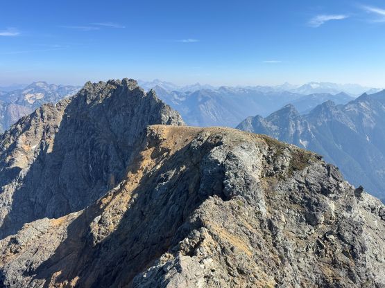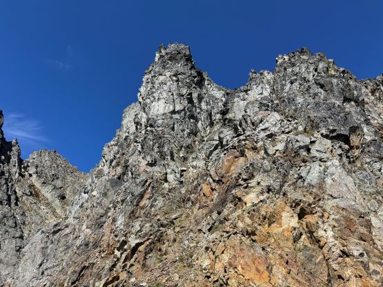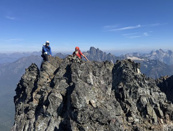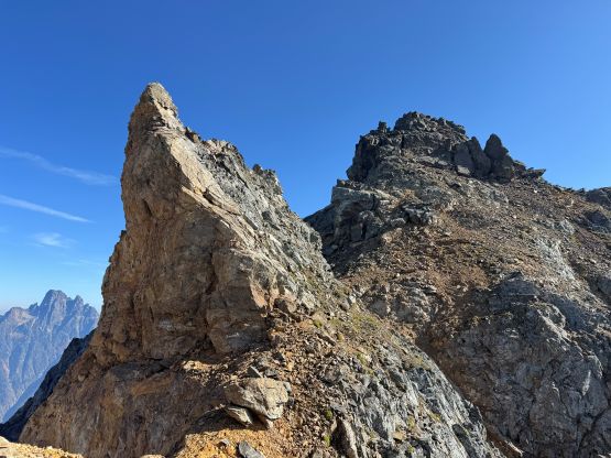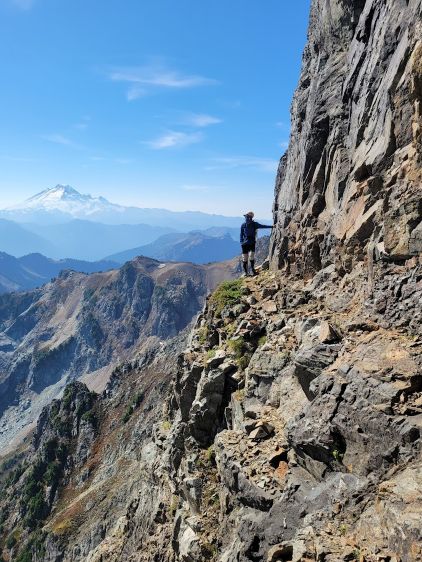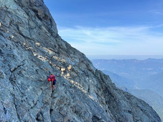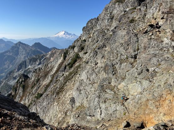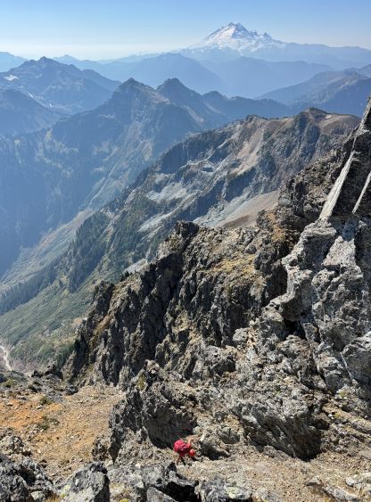 The narrowest parts of the goat ledge was between Peak 3’s scramble route and the 2/3 notch so care was still needed to safely traverse back to Peak 2, where Vlad had been patiently waiting. At this point the three of us still wanted to try Peak 1 so Vlad decided to go ahead to tag Winchester Mtn. which he hadn’t done oddly. Vlad was able to finish his mission quicker than us. There was absolutely no “beta” for the 1st peak but the route-finding wasn’t too difficult. There weren’t many options anyway. I opted for a head start and my strategy was to stay entirely on the ridge crest. There were a series of towers to work around but the scrambling never really exceeded 4th or low 5th class. The crux was a slabby traverse on shit rock with death exposure but thankfully there was an existing rappel station above the pitch. We all soloed this pitch but rappelled on the descent. Immediately above the crux we crawled across a section of 4th class knife edge and then entered the chimney leading up towards the summit. The chimney ended up being technical but I found a way to work things around on the far climber’s left side. The exposure was lethal and the rock quality was absolutely garbage, but at least the moves were non-technical. The summit was only wide enough to fit one person so we took turn standing up there. We also found the John Roper’s old register so this peak did get climbed a few times.