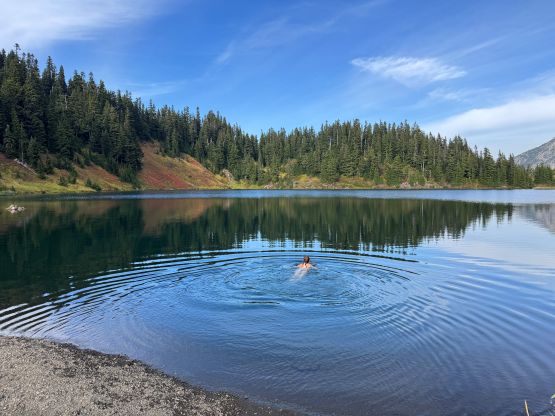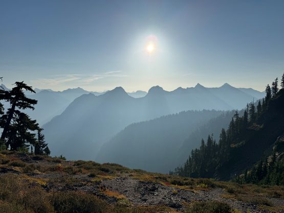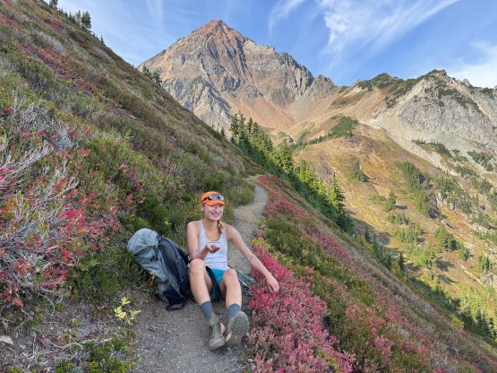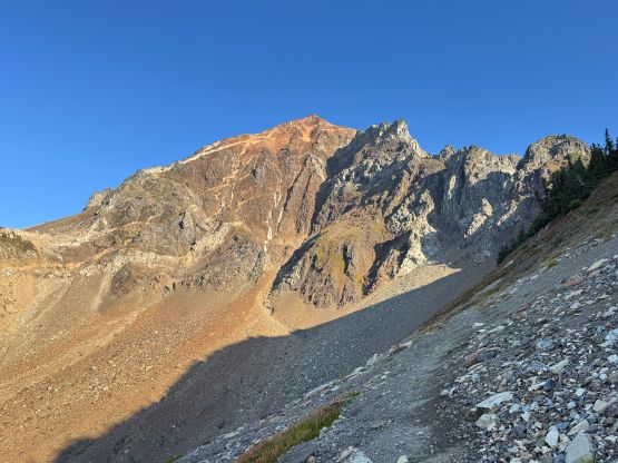 We weren’t doing great on time but at least I caught some sporadic cell reception using the Roamless Plan that I had bought for the Alps trip. This not-so-costly eSIM would work for 200 countries with no time limit so I finally have reliable reception in the U.S. now. The first thing I did was to update my Peakbagger App and the second thing was to inform the potential lateness for work. I managed to push the work from 6 pm to 7 pm but ended up having to further push it to 7:30 pm, which was not ideal but I had no other choice. And because of that I didn’t want to linger any longer than absolutely necessary up there. We managed to down-climb everything except for the crux pitch. I actually went ahead to try down-climbing it but disliked the exposure, so we left a webbing and made a short rappel. The rappel was actually quite awkward as we had to stay on the narrow ridge. To descend the gully underneath Peaks 1/2 Erica and I opted to just wear the trail runners. I was anticipating some difficult times but I actually felt more comfortable in the runners than in the boots. About half an hour later we were back on Mt. Larrabee’s SE shoulder and en route we loaded up the water bottles in one of the running creeks. The Pleiades were in the bag, and so were Canadian Border Peak, American Border Peak and Mt. Larrabee so I never have to touch this group of red choss again. While plodding back to the parking lot we stopped for at least 20 minutes eating blueberries, and then Erica even went for a swim in the lake. As mentioned above I was definitely late for work but we simply couldn’t pass the blueberries and the swim.