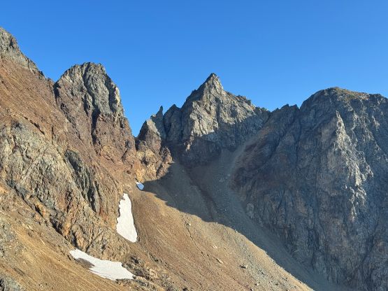 Working our way towards the gully underneath The Pleiades’ Peak 1 we started to encounter more compact choss. Three of us wearing boots opted to use a thin strip of snow to mitigate the misery but Dave, who only had the trail runners actually got far ahead of us by staying entirely on the choss. Higher up we merged into the gully and the strategy was to stay as far climber’s left as possible using “holds” on the wall to work our way up. This section was downright miserable and I would recommend as small of a group size as possible for future parties. Managing rockfall in a group of 4 had become very difficult and significantly reduced our efficiency in moving through this type of terrain. We also encountered at least one 4th class section in addition to lots of 3rd class scrambling in the gully. Upon topping out Erica and I instantly decided to change the footwear back to the trail runners. The first peak didn’t seem “too bad” but since it’s not the highest of them we made the decision to try it out after returning, so we started traversing eastwards towards Peak 2. I was expecting a “walk in the park” but there actually existed a notch with some 4th class scrambling. This notch was already on Vlad’s edge for comfort so he wouldn’t be attempting the other three peaks on this day.