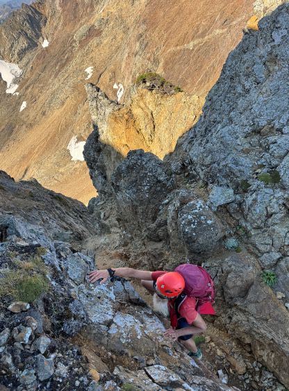 Dave down-climbing the terribly loose summit pitch
