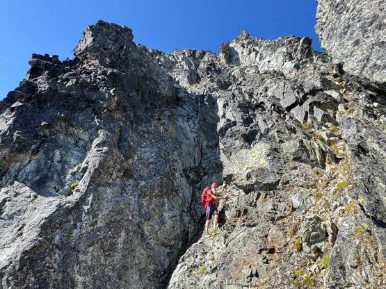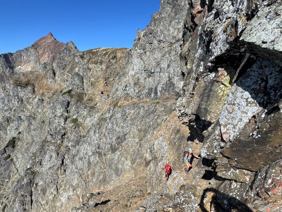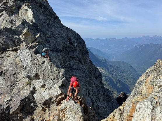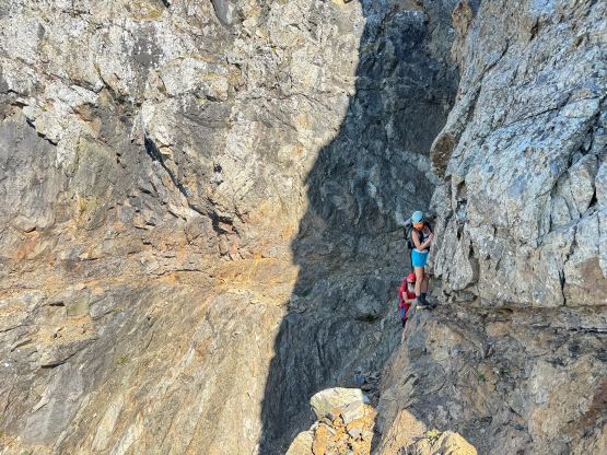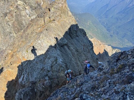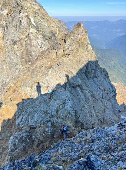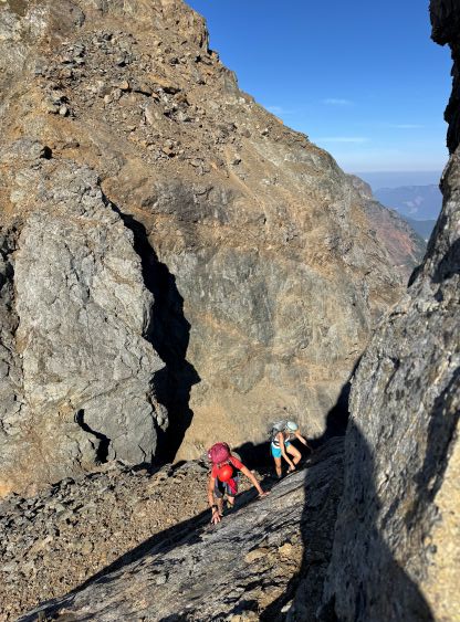 Erica and Vlad down-climbing into Peak 2’s notch