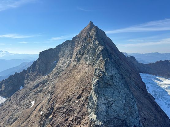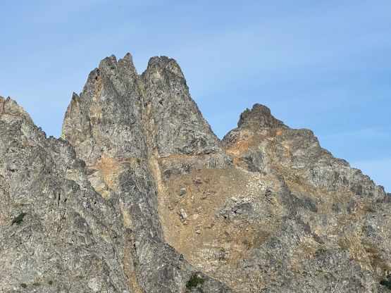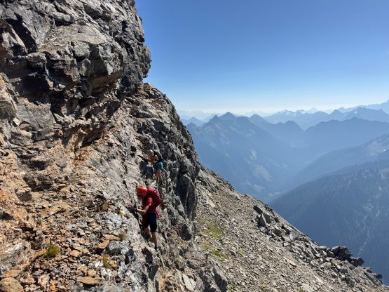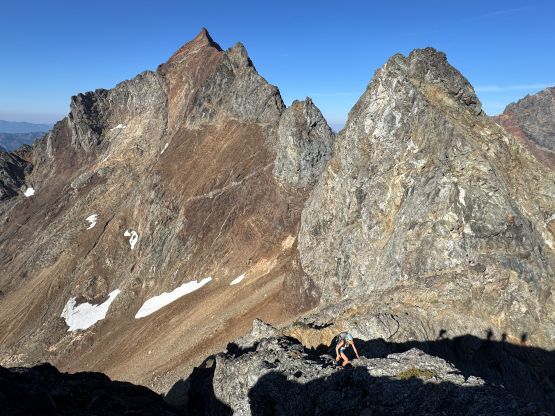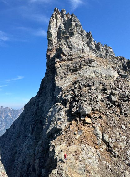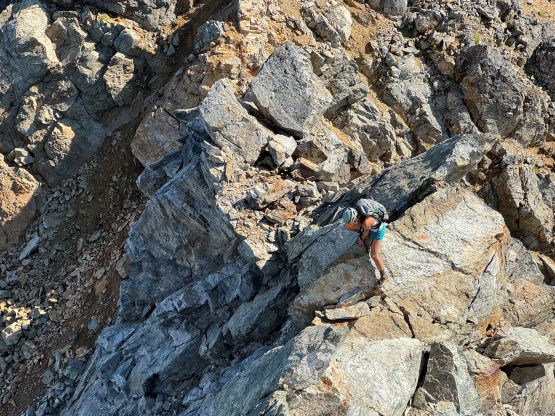 Not doing much lingering we quickly descended back to the 3/4 notch. The re-climb out of the notch felt much easier and so was the goat ledge traverse back to the south side of Peak 3. There were many gullies in the confusing terrain but I had saved several pictures from that NWHikers trip report so we were able to locate the correct gully. We definitely did some variations higher up because our route went straight to the final notch underneath the summit pitch, whereas the NWHikers team went up and over one of the pinnacles to the east. They had likely picked a technically easier variation whereas we basically went straight the hell up this shooting gallery. The scrambling was mostly 3rd class and wasn’t too bad until the very end. The final pitch to the summit was class 3/4 but the rocks were some of the worst I had ever touched, in the Cascades or the Rockies. I told Erica that she should be ready for the Goodsirs after this climb. Erica even went for a bonus pinnacle. The position was excellent for the photos but the rocks looked as bad as that old man’s ass that I involuntarily observed on Wöllaner Nock. Dave had brought his own register and we left it on the highest peak of The Pleiades, and then gingerly down-climbed back to the goat ledge. We had to break down this descent into stages and absolutely had to down-climb one at a time. Needless to say, it took us forever.