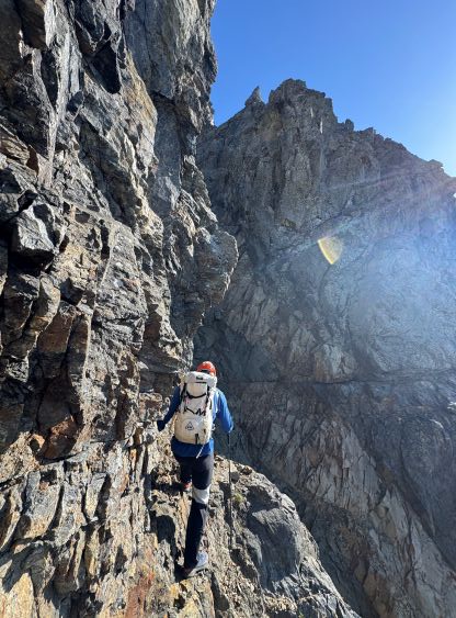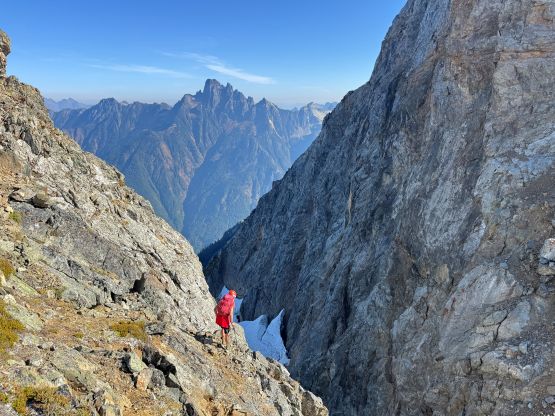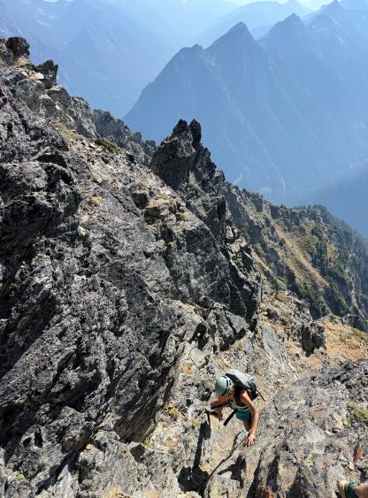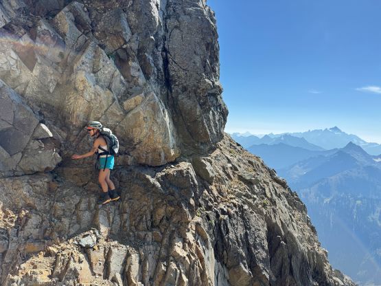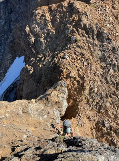 Erica down-climbing underneath the summit of Peak 1
