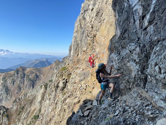 Descending towards Peaks 2/3 saddle was much longer than I thought and involved 100 m elevation loss or more, and it is actually this saddle that earns the P100m status for The Pleiades’ 3rd peak. The descent started out straightforwardly but quickly became a mental game of concentration. Nearing the bottom the terrain started to become vertical but I was looking hard for Sean’s “class 3 gully” to bypass the rappel mentioned in the NWHikers trip report. Dave went ahead and simply down-climbed the rappel route but I did successfully find the easier variation. The gully was followed by a ramp and was actually not that bad comparing to the rest of the route. Erica followed, but Vlad turned around. I casually told Vlad that we would be back in an hour but it ended up taking us 2.5 hours. I forgot that we also had Peak 4 to ascend in addition to the true summit (Peak 3). We then scrambled up some chossy blocks as well as a short pitch of blank slabs to access the infamous goat ledge. Unfortunately (or fortunately), there wasn’t goats leading us across this ledge, but the route was obvious. At least 70% of the ledge was wide enough to comfortably walk but the other 30% required some very exposed scrambling. We made the final decision to go for Peak 4 first so traversed to the very end of the ledge. The crux for the 4th peak was the down-climb into Peaks 3/4 notch, which was a pitch of 4th class of shit rocks. This notch was much harder than the one to get to Peak 2 so Vlad definitely made a good decision to turn around. The rest of the ascent to the summit of Peak 4 was not too terrible but was still loose as hell.