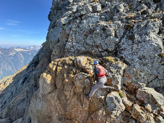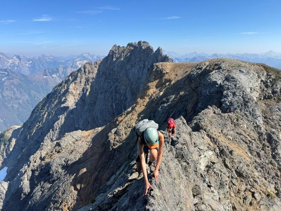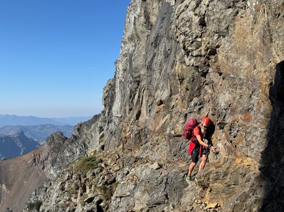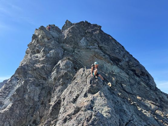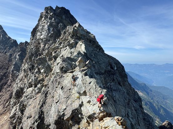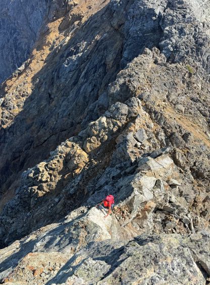 The true knife edge on questionable rock, above the crux pitch