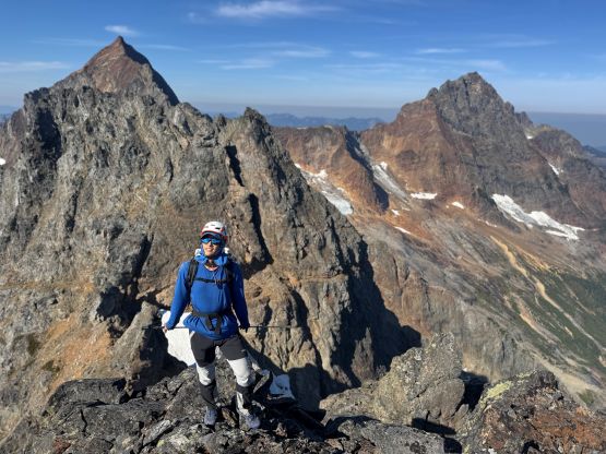 Erica approaching the summit of Peak 2 with Mt. Larrabee and Peak 1 behind