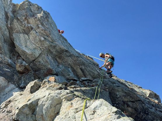 Erica down-climbing Peak 3’s summit pitch
